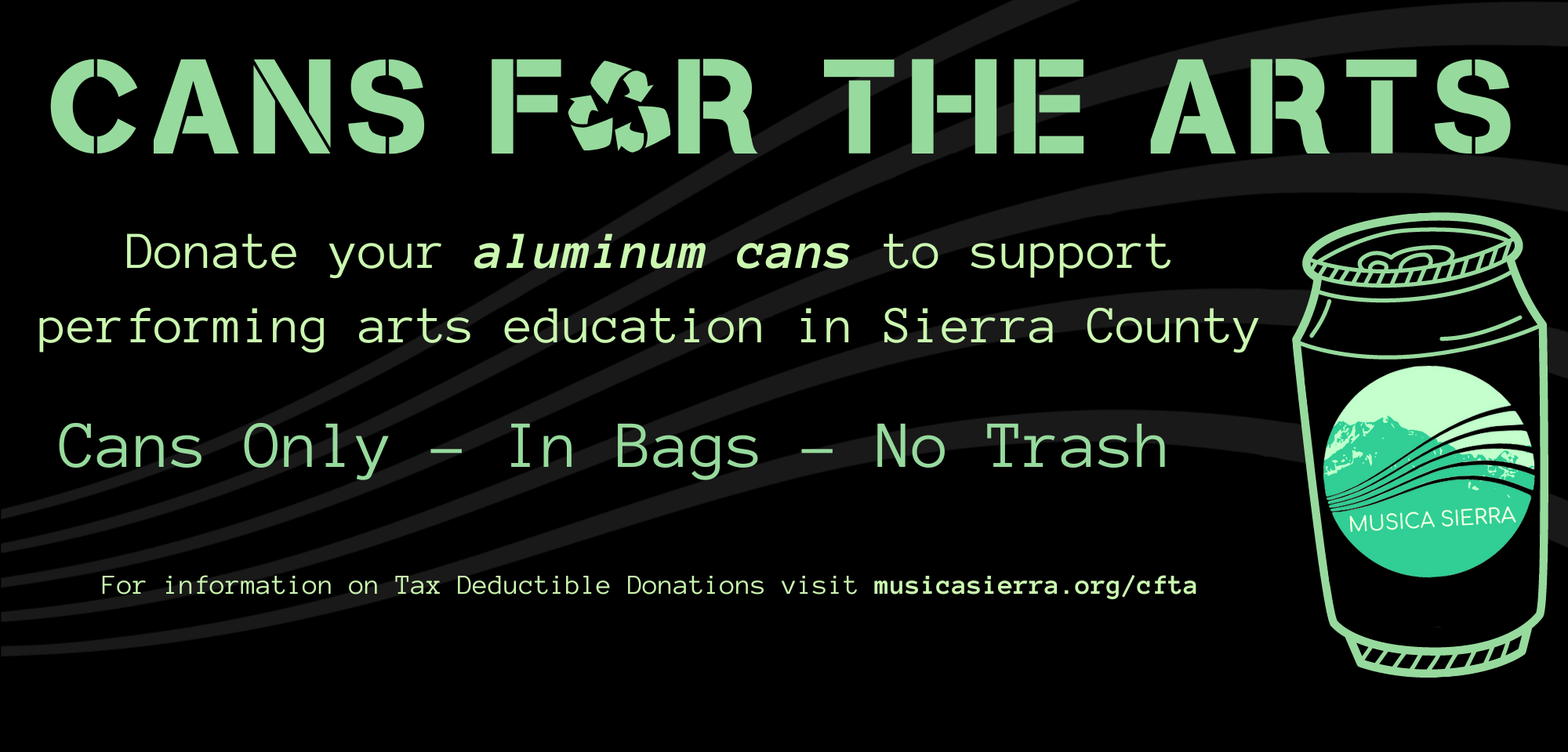 Cans for the Arts is an ongoing fundraising outlet for Musica Sierra. Donate your aluminum cans to help keep our schools' performing arts education alive!