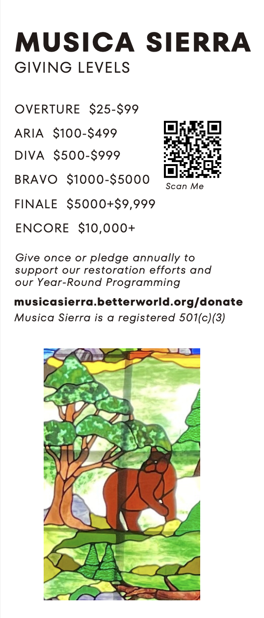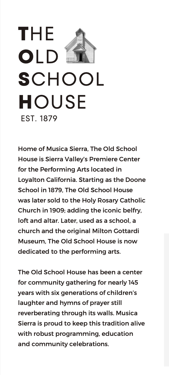 Musica Sierra, alongside the residents of Sierra Valley, is embarking on an exciting journey to renovate this magnificent space into a community arts center. This center will be a dedicated venue for the performing arts and educational programming for all ages. Supported by the Rotary Club, Loyalton City Council, and numerous local businesses and individuals, our community is dedicated to revitalizing this historic building. If you’d like to be part of this transformative project, please reach out. We look forward to building this together!"